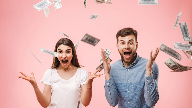 casal formado por um homem e uma mulher gritando em uma chuva de dinheiro em fundo rosa