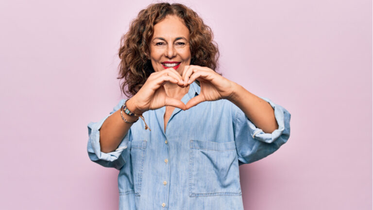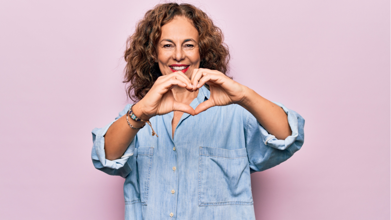 mulher mais velha fazendo coração com as mãos em fundo lilás