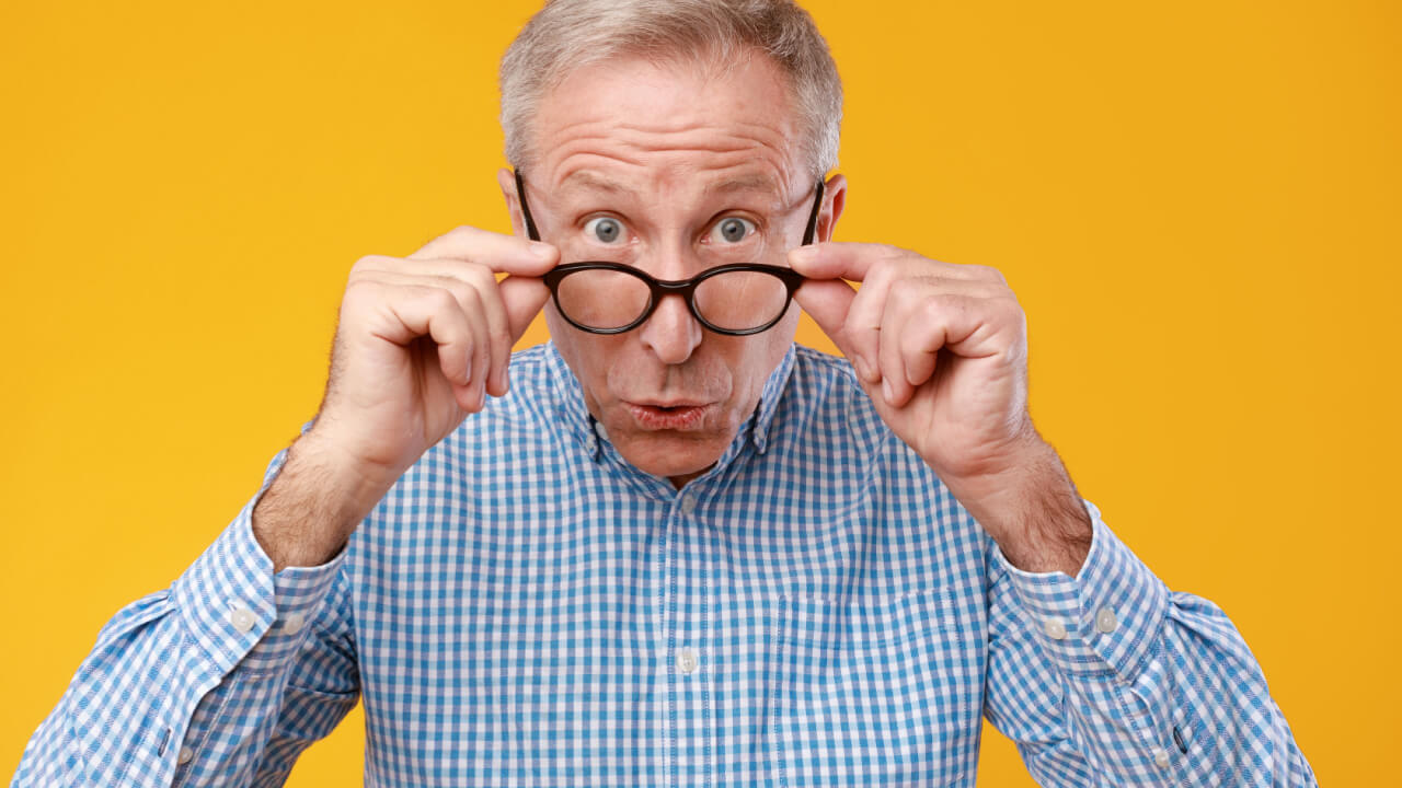 Retrato aproximado de um homem surpreso, olhando para a câmera, tirando os óculos, isolado em um fundo de um estúdio laranja.