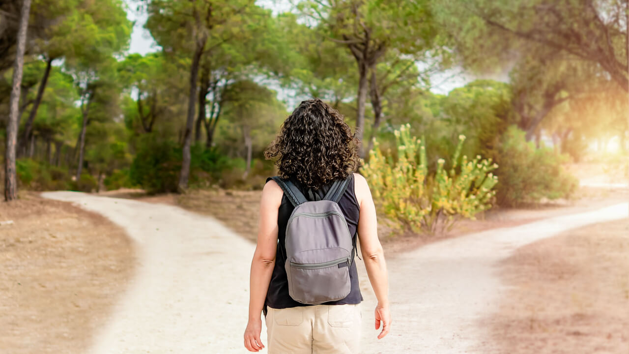imagem de uma mulher de costas com uma mochila e ela está olhando para uma estrada de dois caminhos em uma floresta
