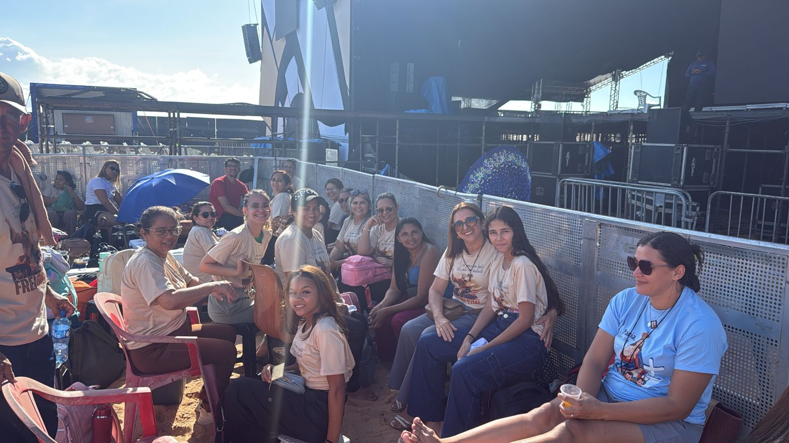 Ela, que é do município de Macaíba, no RN, está junto a uma caravana, que veio preparada com guarda-sóis, cadeiras e chapéus para aguardar o show.