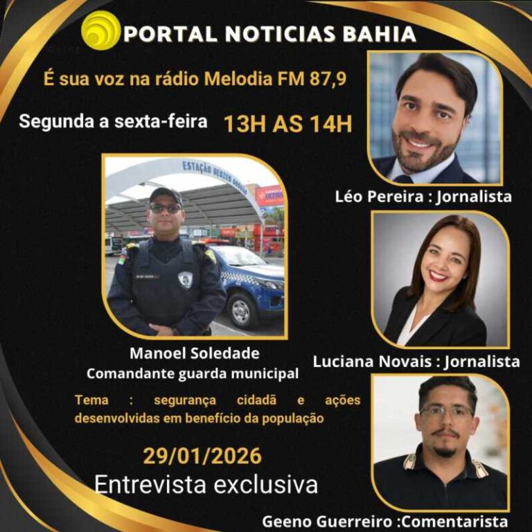 O programa Portal Notícias Bahia promove, na quinta-feira, 29 de janeiro, às 13h, uma entrevista especial com o novo comandante da Guarda Municipal, Manoel Soledade, em transmissão ao vivo pela Rádio Melodia FM. O encontro promete ampliar o debate sobre segurança cidadã e apresentar à população as ações estratégicas que vêm sendo desenvolvidas em benefício da comunidade.