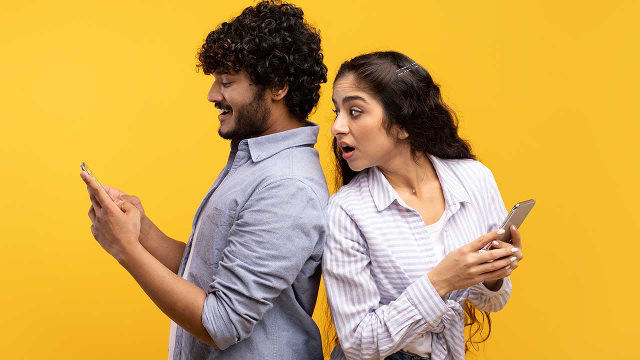 mulher olhando para o celular do namorado que está de costas para ela em fundo amarelo