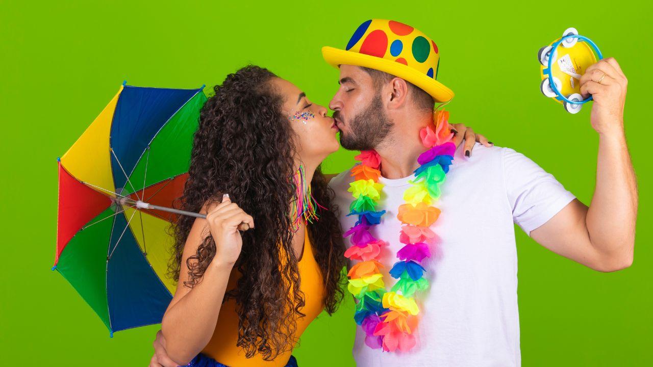 Imagem de um casal fantasiado para o Carnaval se beijando