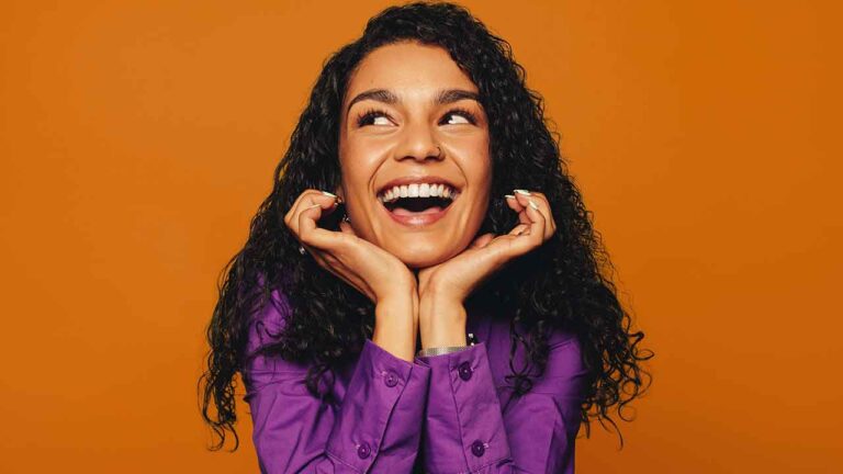 mulher negra de sorriso larga com a mão no queixo em fundo laranja