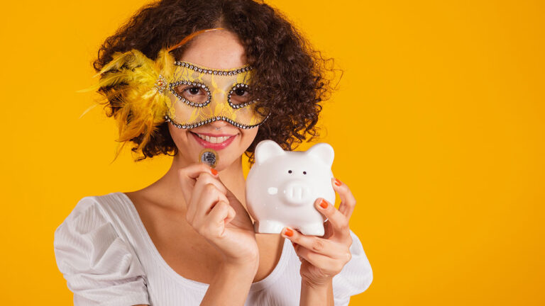 mulher com máscara de carnaval segurando um cofre de porquinho em fundo amarelo