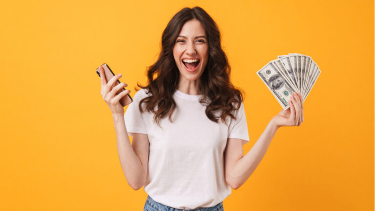 mulher com sorriso largo segurando um leque de dinheiro em fundo amarelo