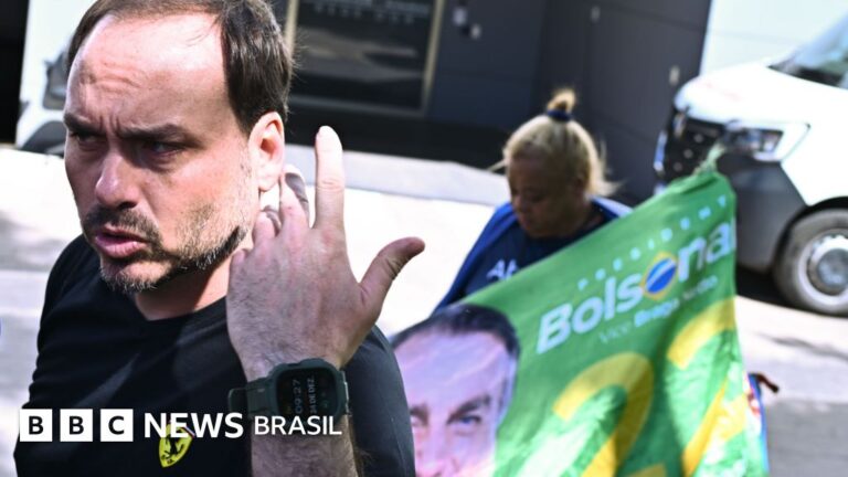 Legenda da foto, Flávio Bolsonaro, filho do ex-presidente brasileiro Jair Bolsonaro, fala com jornalistas após deixar a sede da Polícia Federal