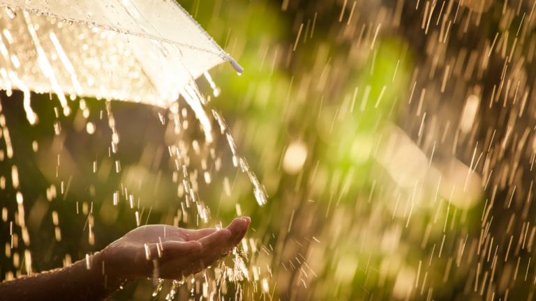 Imagem de chuva caindo sobre um guarda chuva transparente e uma mão esticada sentindo os pingos de água
