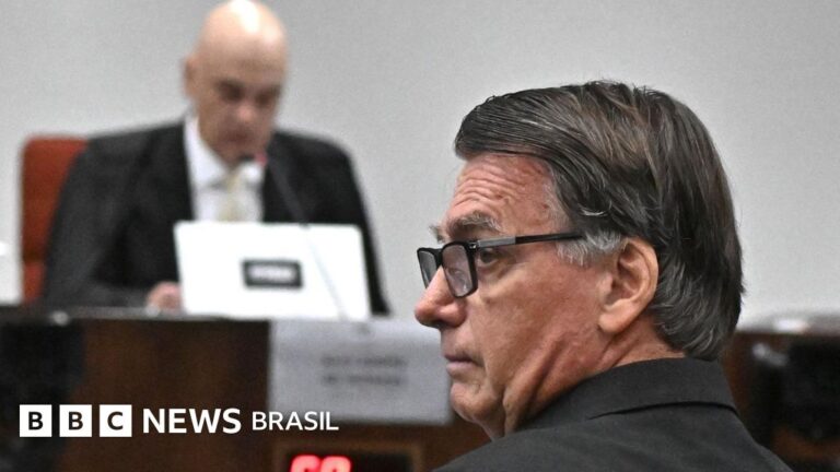 Legenda da foto, Imagem de Bolsonaro no STF em 10 de junho, quando Alexandre de Moraes interrogou o ex-presidente e outros cinco réus sobre acusação por tentativa de golpe